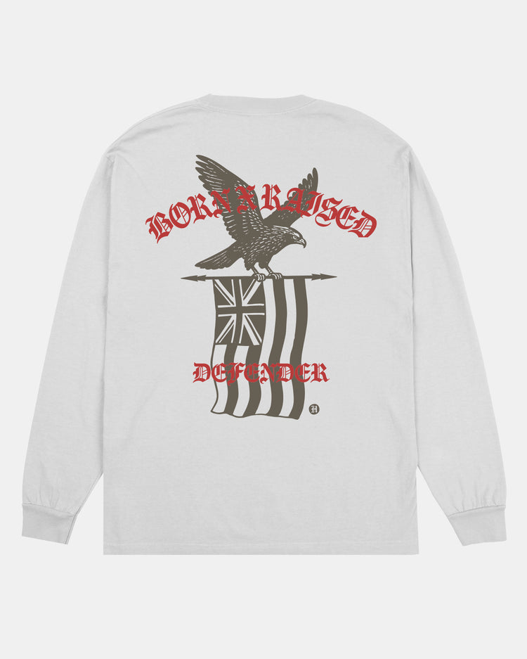 Defend Hawai'i - Island made, island born and raised. This is IO B&R. Featuring a mid flight pocket hit and patriotic back hit. Pick your favorite colorway. This one comes in gray and red ink on a white casual fit t-shirt. Your everyday tee to DEFEND with.