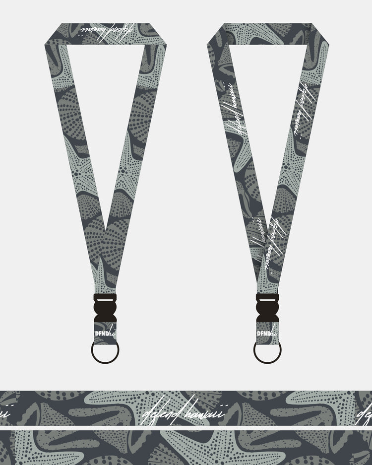 Defend Hawai'i accessories. One of our most popular products and an easy gift for anyone, a Defend Hawai'i lanyard. Beach Walk Lanyard, white on a shades of gray and blue background.