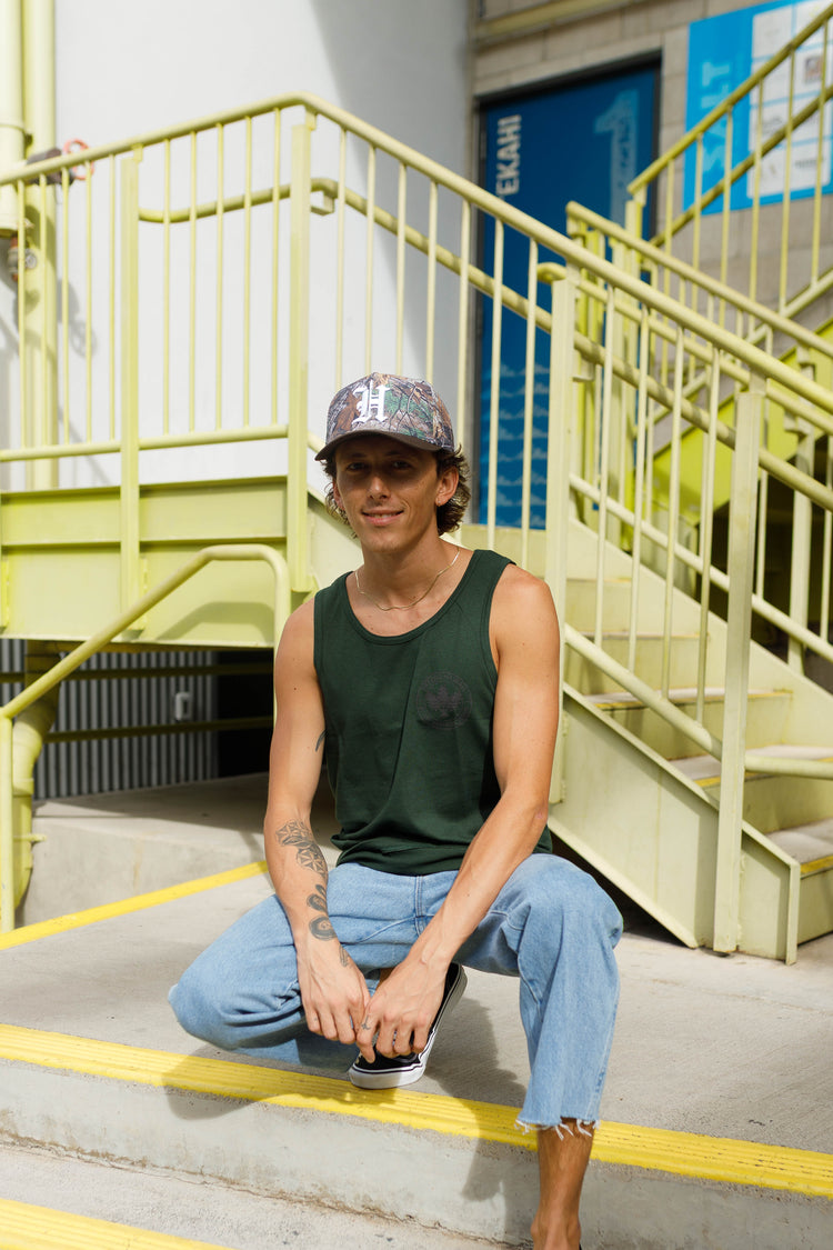 Defend Hawai‘i - Bringing back our staple headwear, featuring the beloved H Spear design. This time embroidered in gray on a red, beige, and navy snapback. A hae Hawai'i (Hawaiian flag) patch embroidered on it's side. This one is a cotton a-frame snapback hat, with a beige crown, black eyelets, red brim, and button with a snap closure.