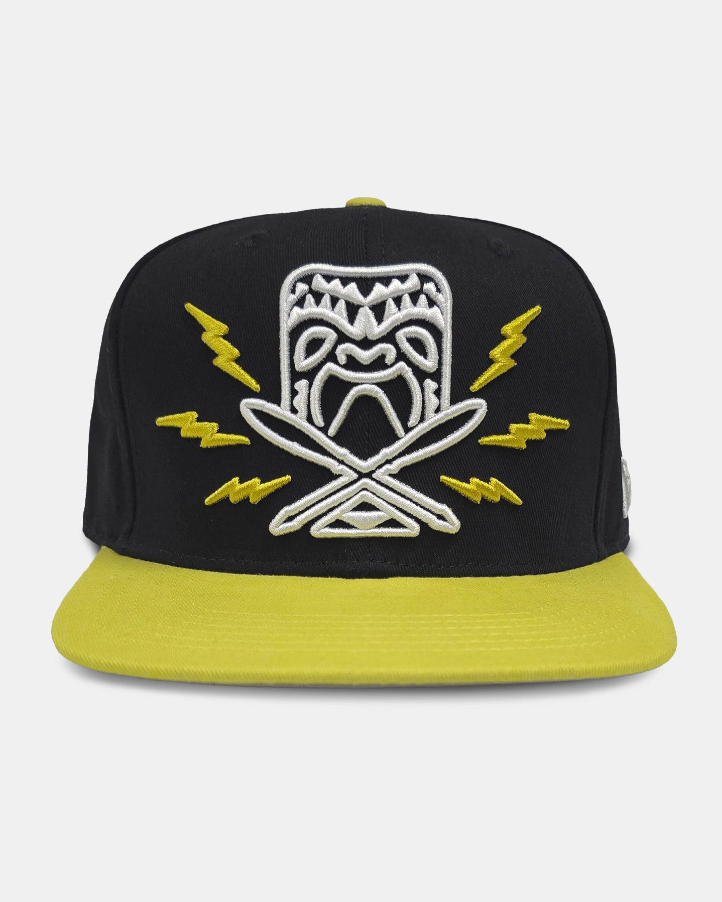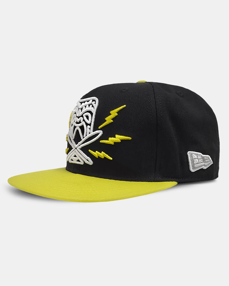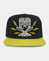 Defend Hawai'i headwear back with the Ki'i Bang Bang design for our original defenders. Embroidered in white and safety green on the crown. A hae Hawai'i (Hawaiian flag) patch embroidered on it's side. This one is a cotton casual fit black trucker hat, with a black crown, black eyelets, black brim, and button with a snap closure.