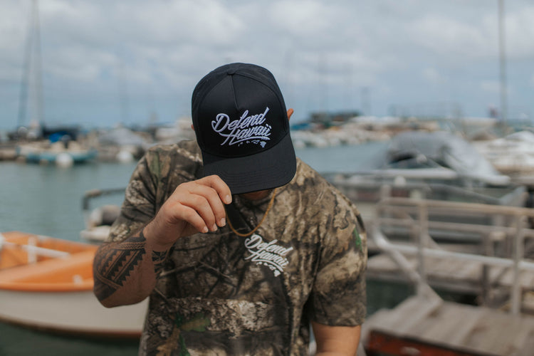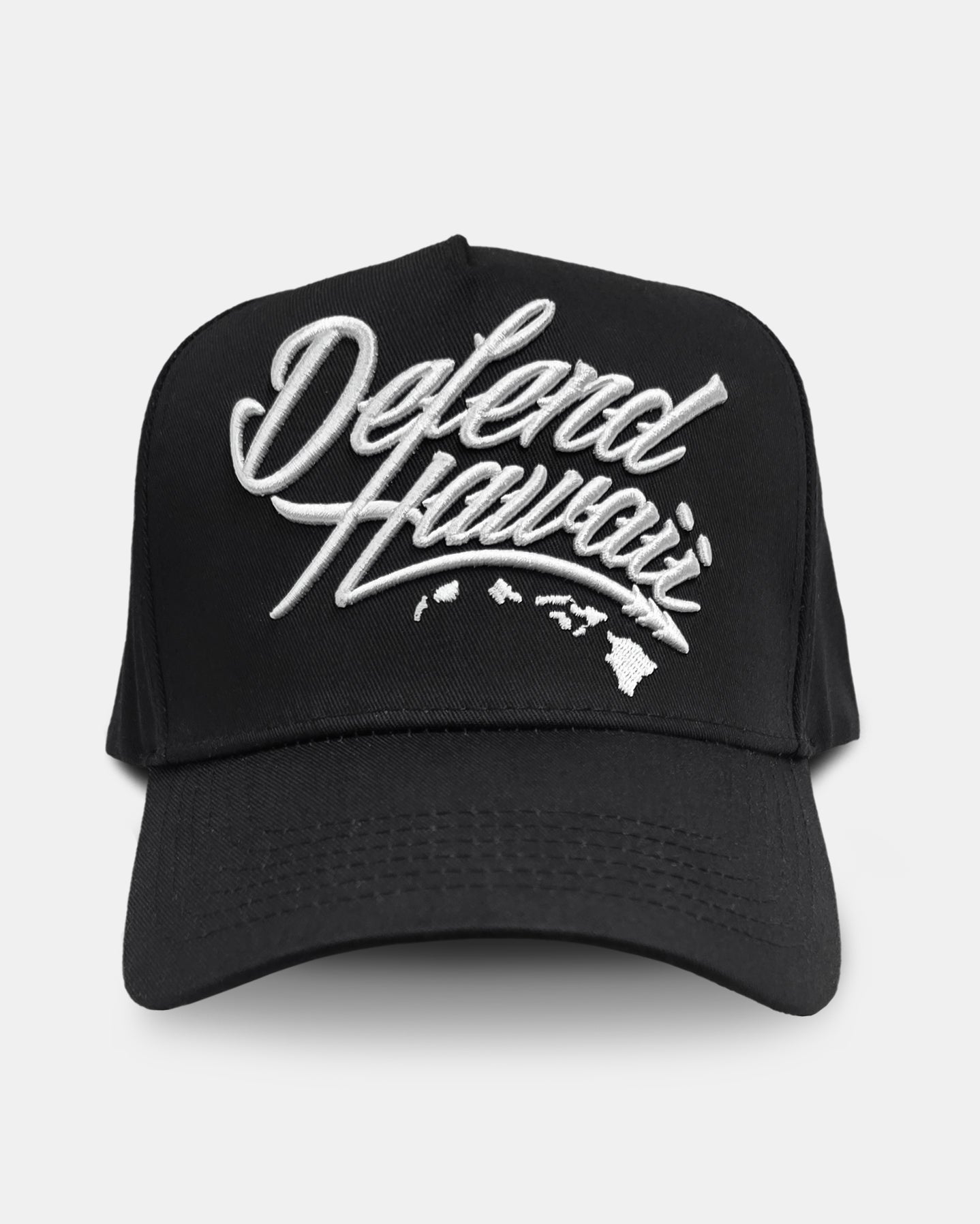 Defend Hawai'i - Back with another staple Wildstyle Logo hat. This time embroidered in white on the cotton 6 panel black a-frame snapback hat. With a black crown, black eyelets, black brim, and button with a snap closure.