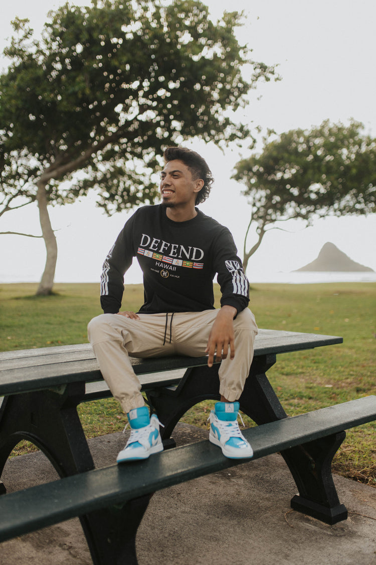 Defend Hawai'i - A new hae rendition featuring the greatest hits. Hae Hits features a center chest hit and a double sleeve hit. Pick your favorite colorway, this one comes in white and multi color ink on a black or navy casual fit long sleeve. Your everyday tee to DEFEND with.