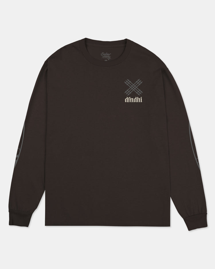 Defend Hawai'i - Introducing Me Ka Ihe- "Royal Father Kamehameha shall defend in war with spears". Featuring a spear pocket hit and a sharp back hit. Pick your favorite colorway, this one comes in sand and red ink on black casual fit long sleeve. Your everyday tee to DEFEND with.