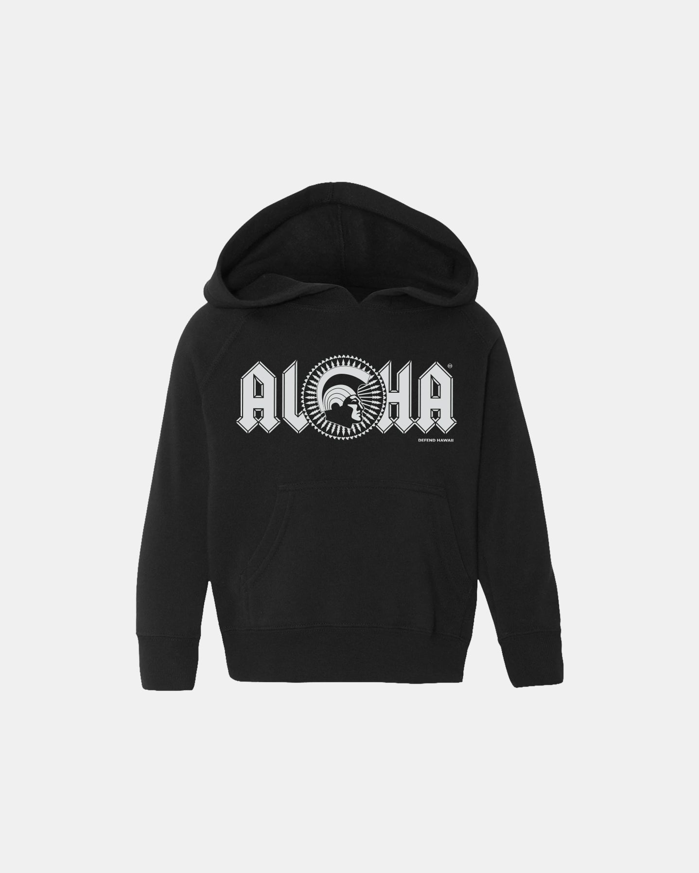 Defend Hawai'i - Rock, paper, scissors - Mai Ka Po'o. This time for the keiki! Pick your favorite color way. This comes in white ink on a black midweight fleece pullover hoodie.