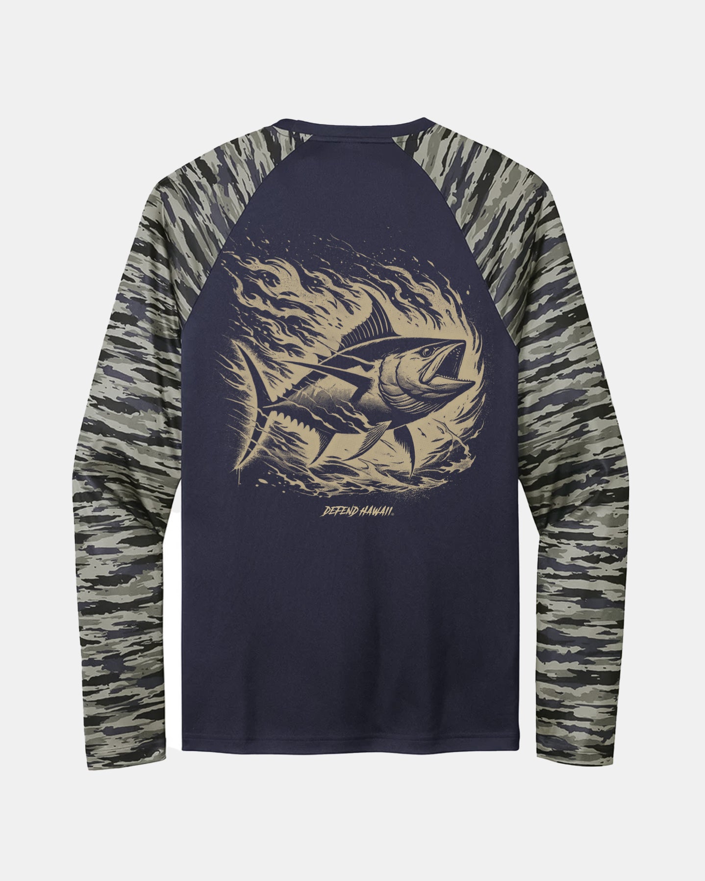 Defend Hawai'i - Fresh fish, sold by the pound. Ahi Burna featuring a clean line pocket hit and a hot back hit. Pick your favorite color way. This one is available in sand ink on a camo sleeve, navy body sport tech raglan.