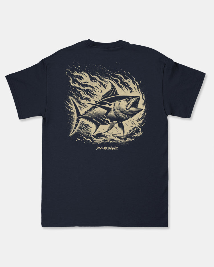Defend Hawai'i - Fresh fish, sold by the pound. Ahi Burna featuring a clean line pocket hit and a hot back hit. Pick your favorite color way. This one is available in sand ink on a black or navy regular fit tee.