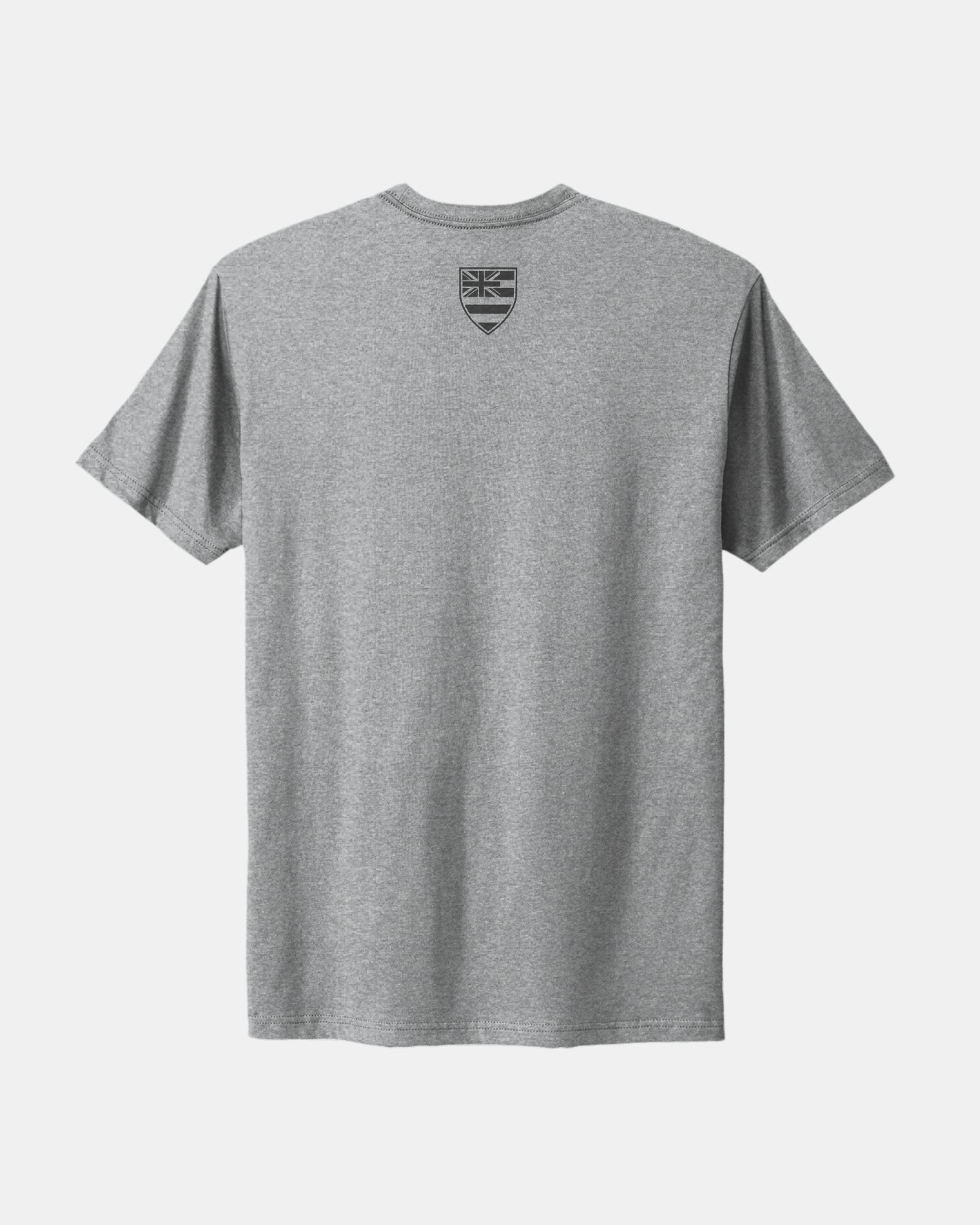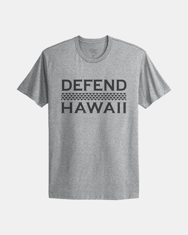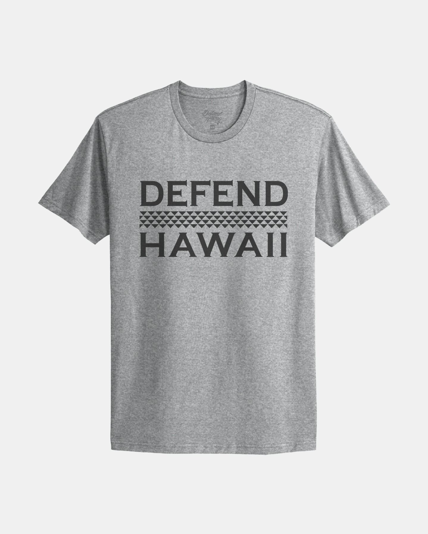 Defend Hawai'i - The classic look is back centered with a triangle block. This is, DH Trilocks. Featuring a center chest hit and a flag shield upper back hit. Pick your favorite colorway, this one comes in black on an athletic heather premium fit t-shirt. Your everyday tee to DEFEND with.