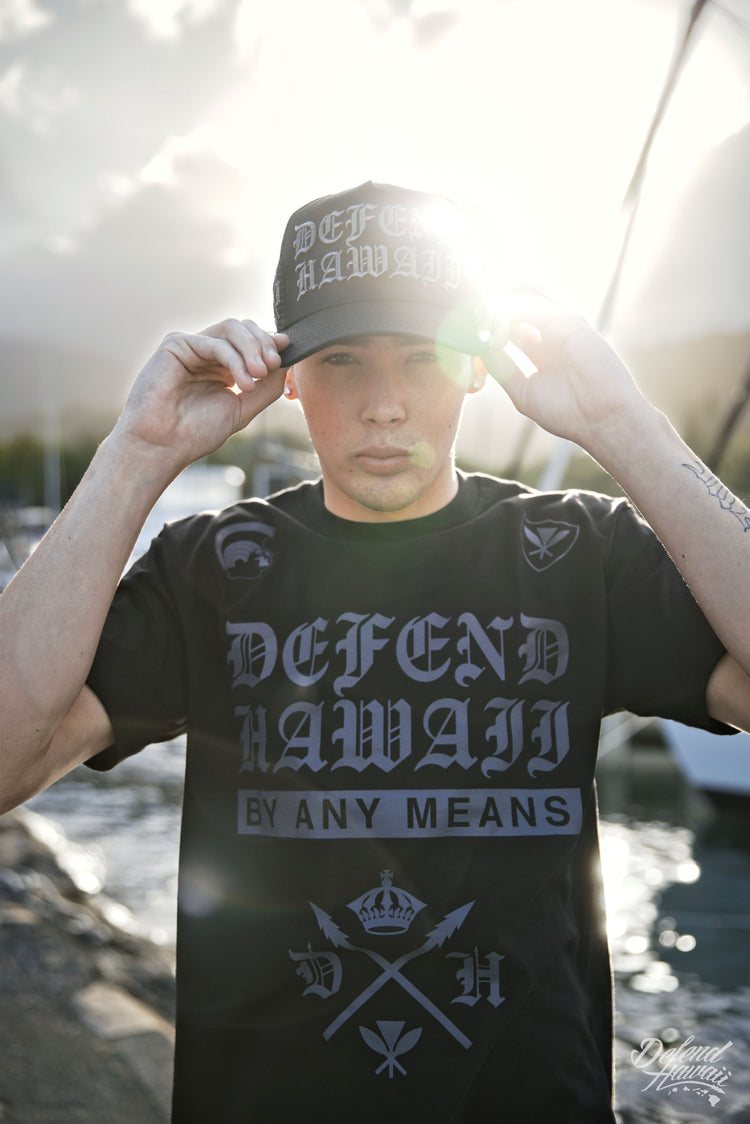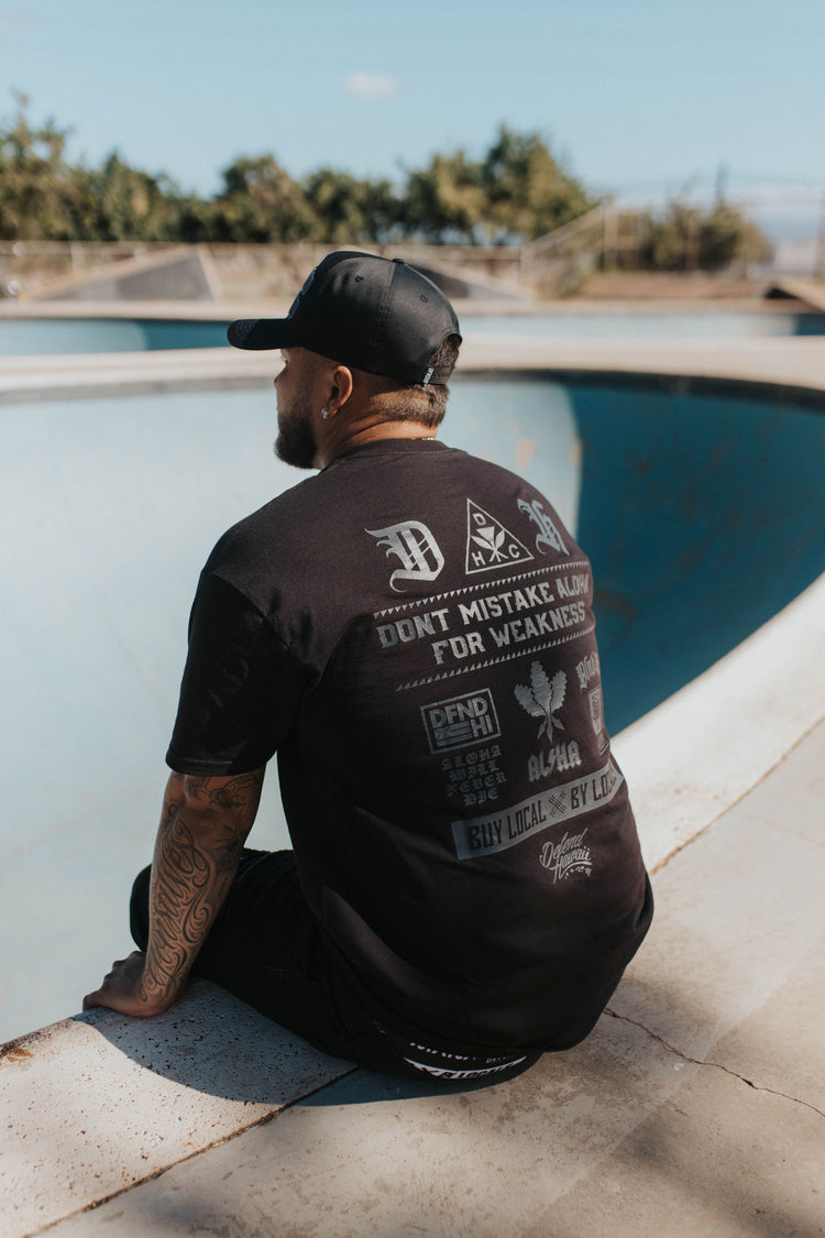 Defend Hawai'i -This one's hard. Our stapled logo design is back with all your favorite Hawai'i Kine Tings. A mix of your favorite Defend Hawai'i logos paired with a few reminders to not mistake aloha for weakness, by any means necessary. This one comes in dark gray ink on a black casual-fit tee.