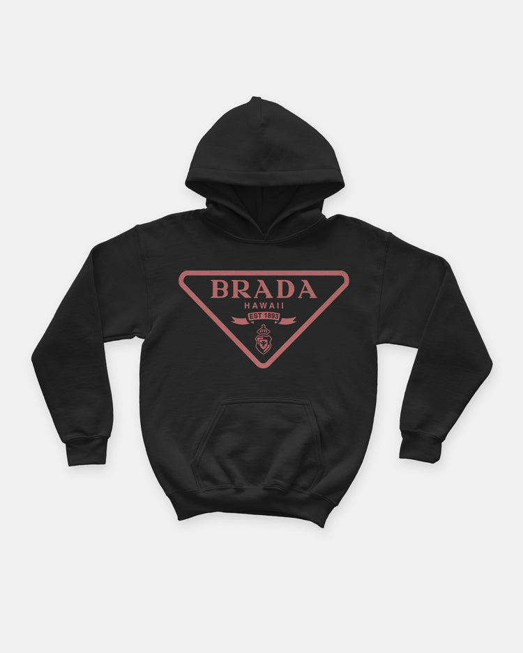 Defend Hawai'i - Step out with our newest luxury look. Another parody design in the books, this time for the keiki. Rep our newest Brada design straight across the chest in your favorite color way. This one comes in pink ink on a black kid's pullover hoodie. Start 'um young, keiki defenders!