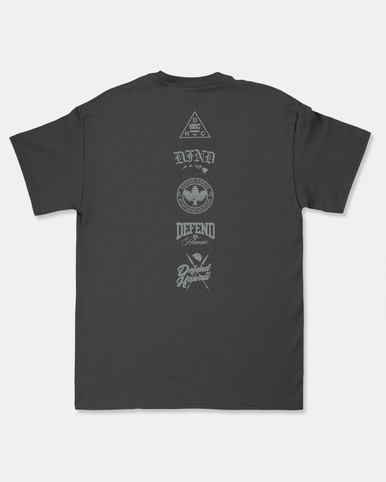 Defend Hawai'i - Your favorite Defend Hawaii Logos all in one, we're in the DH Era. Just the right balance of rigid and flexible, but never weak. Featuring a double logo pocket hit and 5 logos down the spine. Pick your favorite color way. This one comes in white on black and slate on charcoal casual fit long sleeve t-shirt.