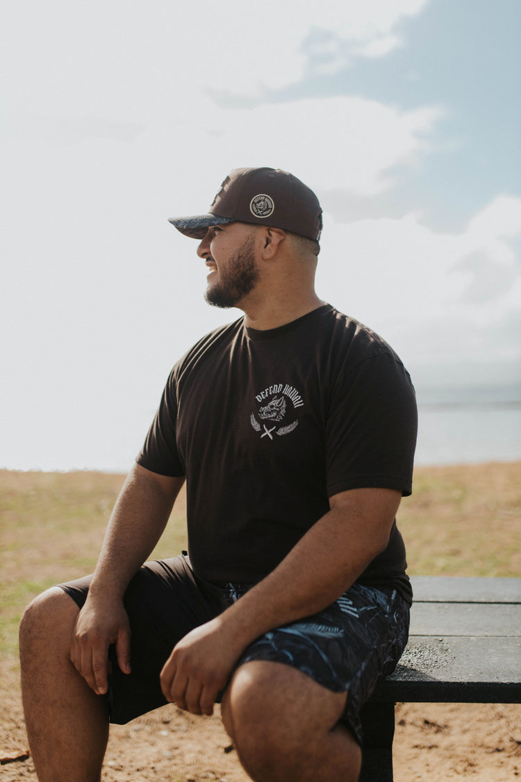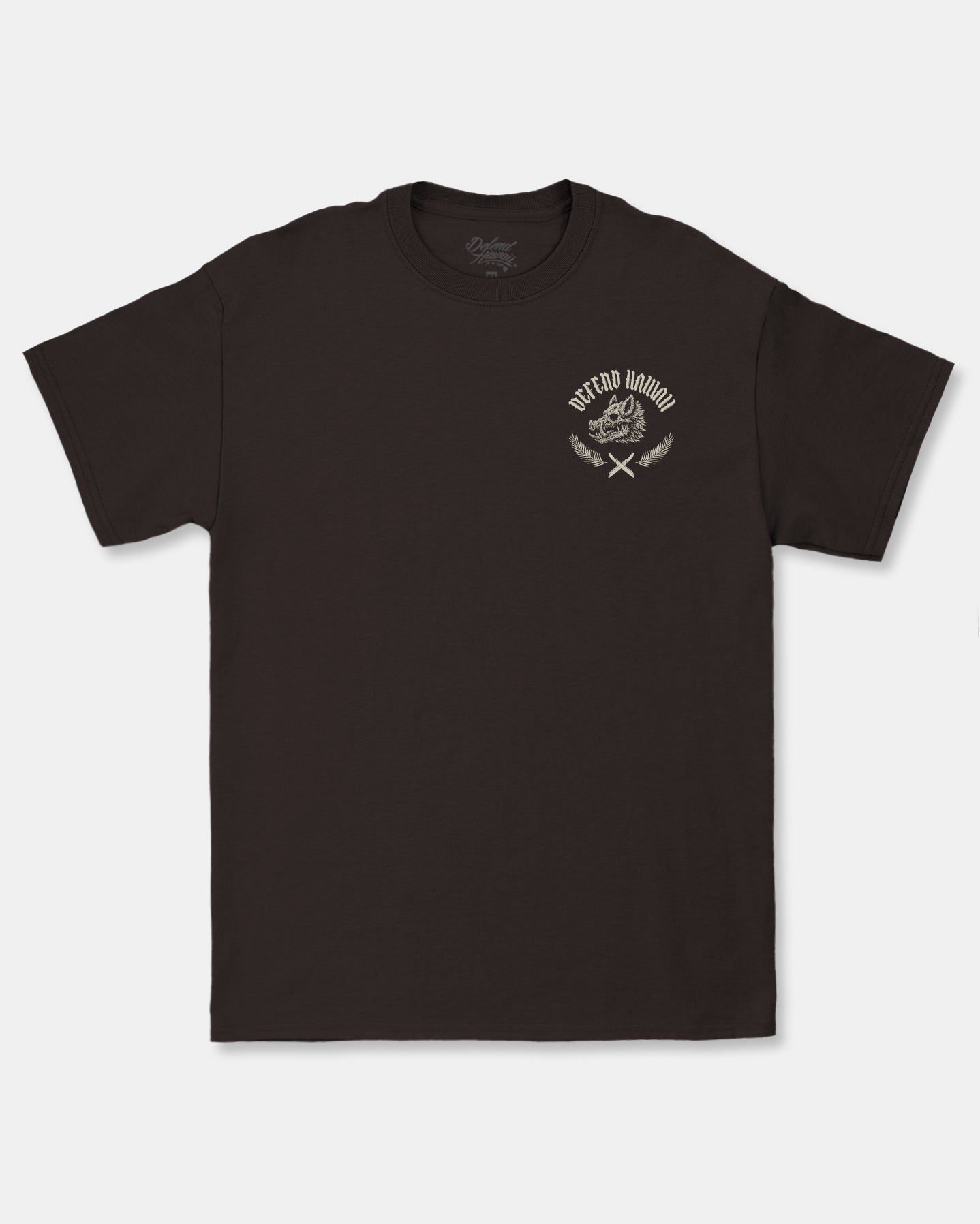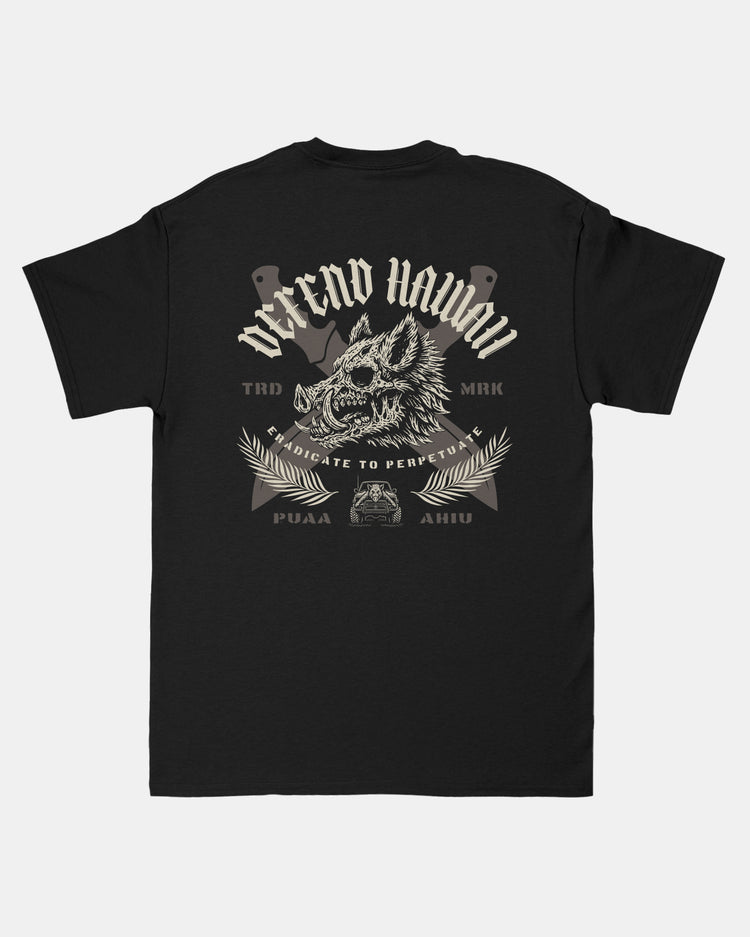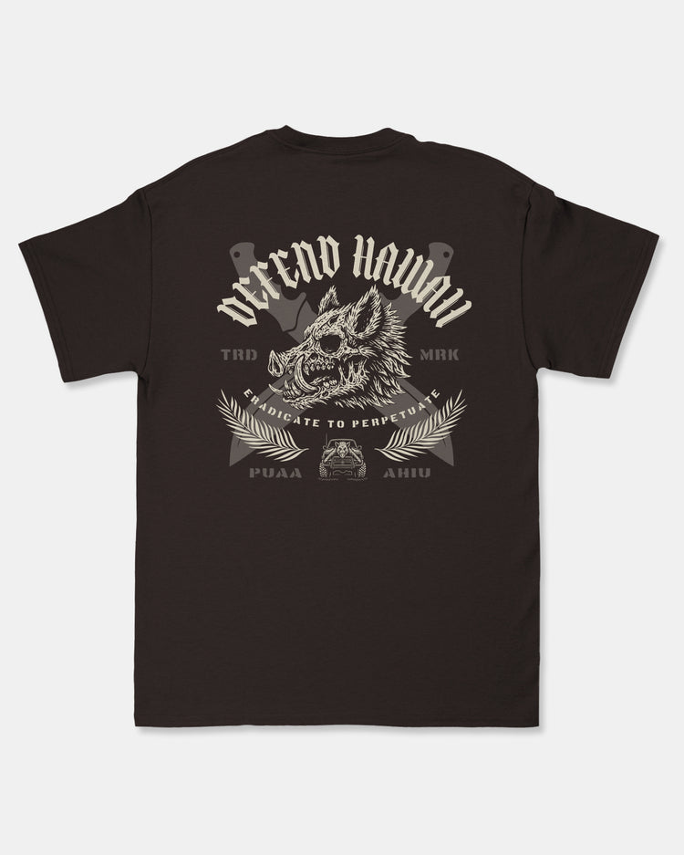 Defend Hawai'i - A new addition to our eradicators saga for da boar huntahz, and an homage to the huntin dogs. This is E2P Zombie. Pick your favorite colorway, this one comes in sand and gray ink on a black or brown casual fit t-shirt. Your everyday tee to DEFEND with.