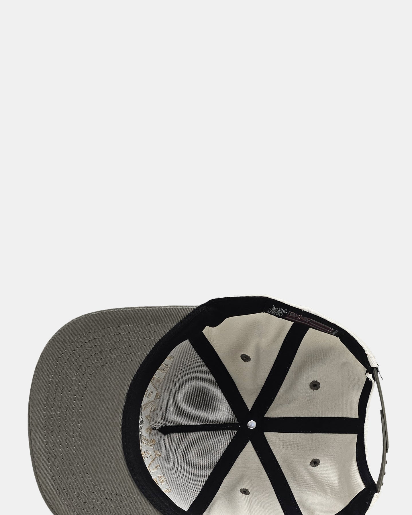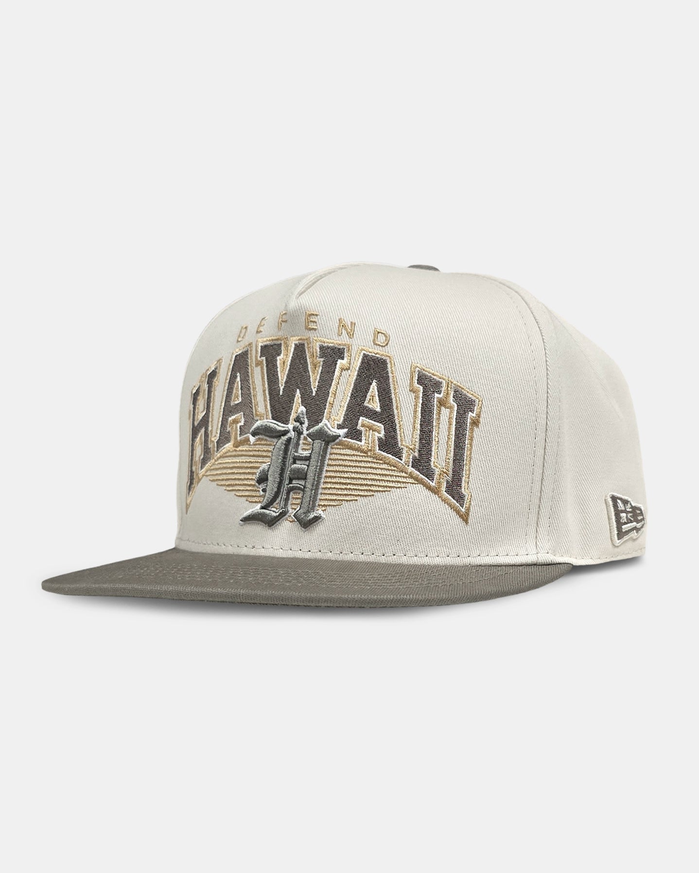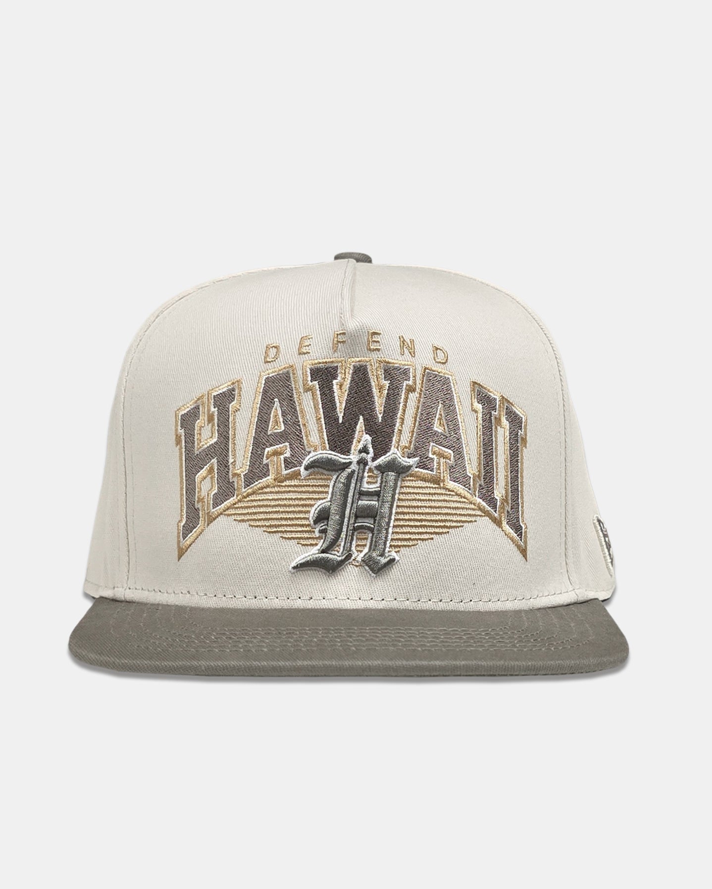 Defend Hawai‘i - Bringing back our staple headwear, this one, a collegiate throwback. This is H-Spear U. This time embroidered in our warrior green and orange on a tan and brown snapback. A hae Hawai'i (Hawaiian flag) patch embroidered on it's side. This one is a cotton a-frame snapback hat, with a white crown, black eyelets, brown brim, and button with a snap closure.