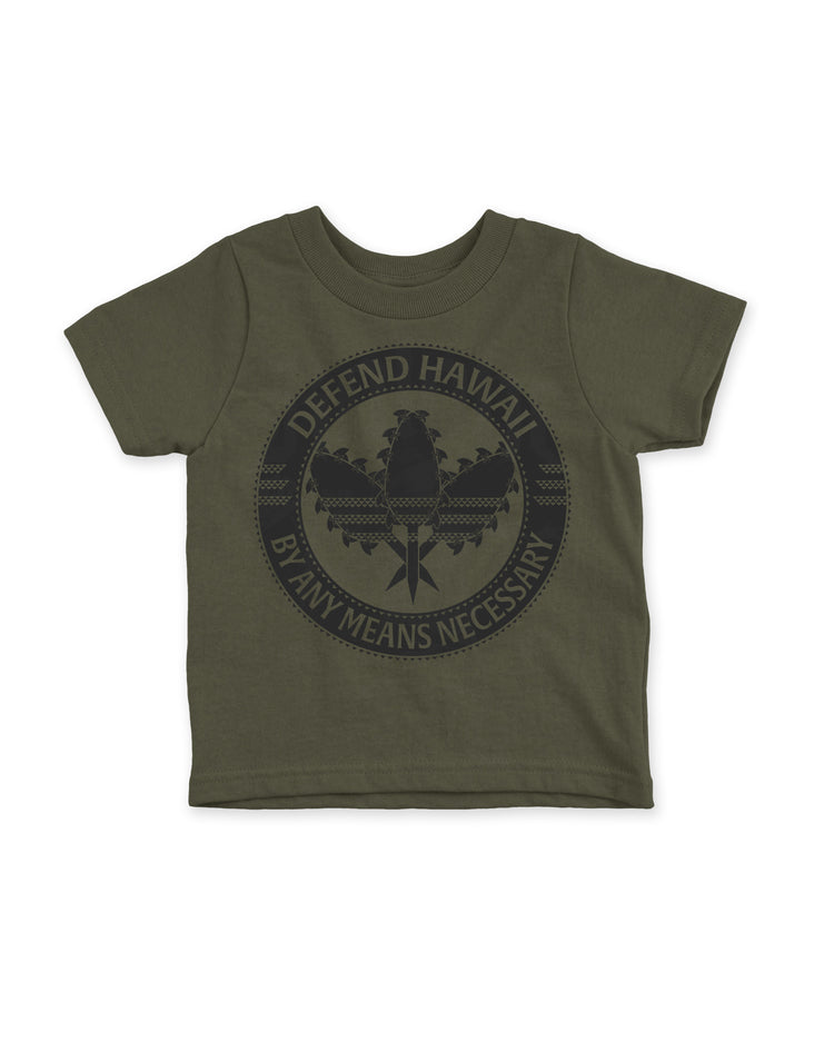 Defend Hawai'i - Bringing back a bold look, the three stripes included. This is Lei O Mano Emblem, this time for da keiki. Pick your favorite color way, this one comes in black ink design on an athletic heather or military green casual-fit kids tee.