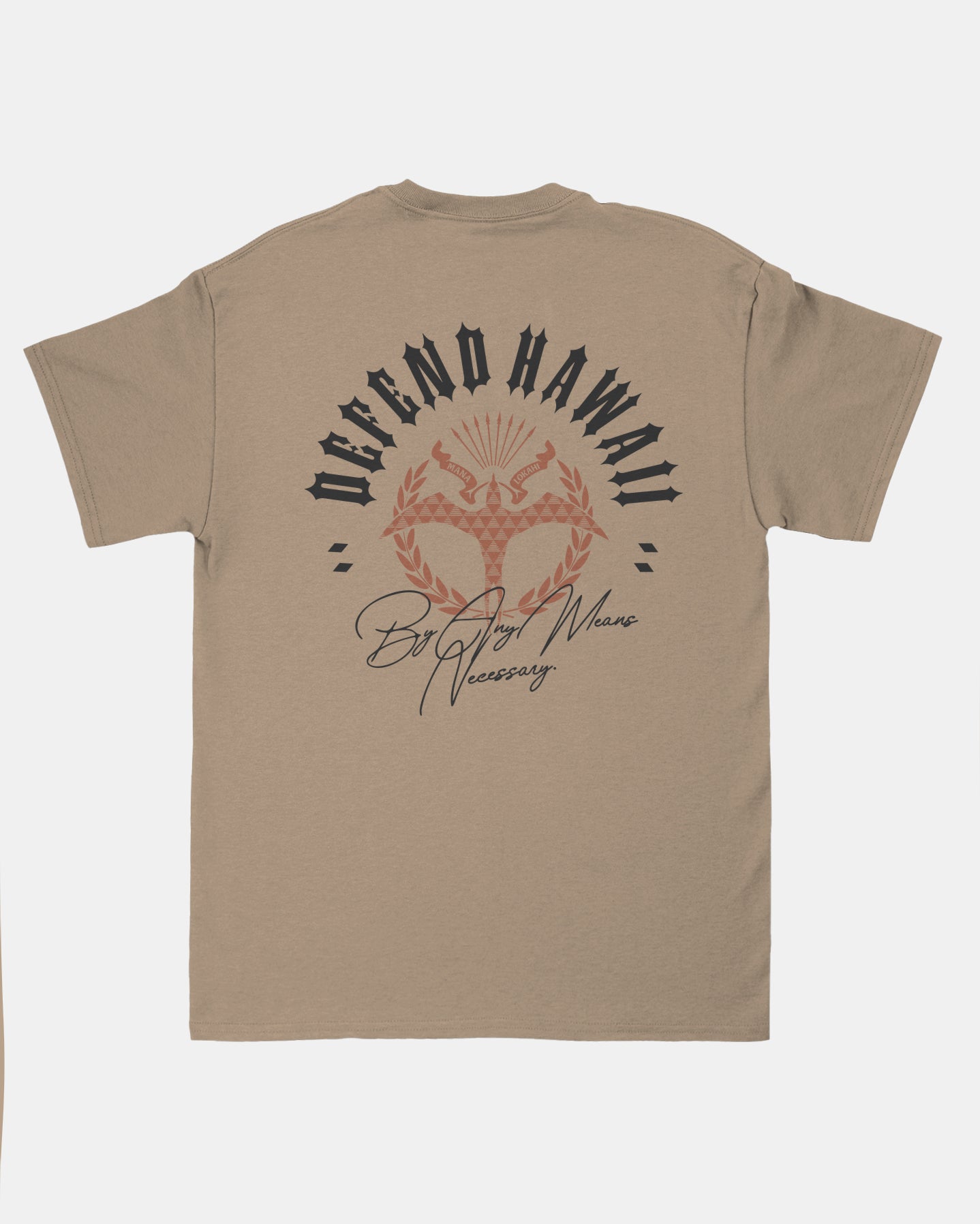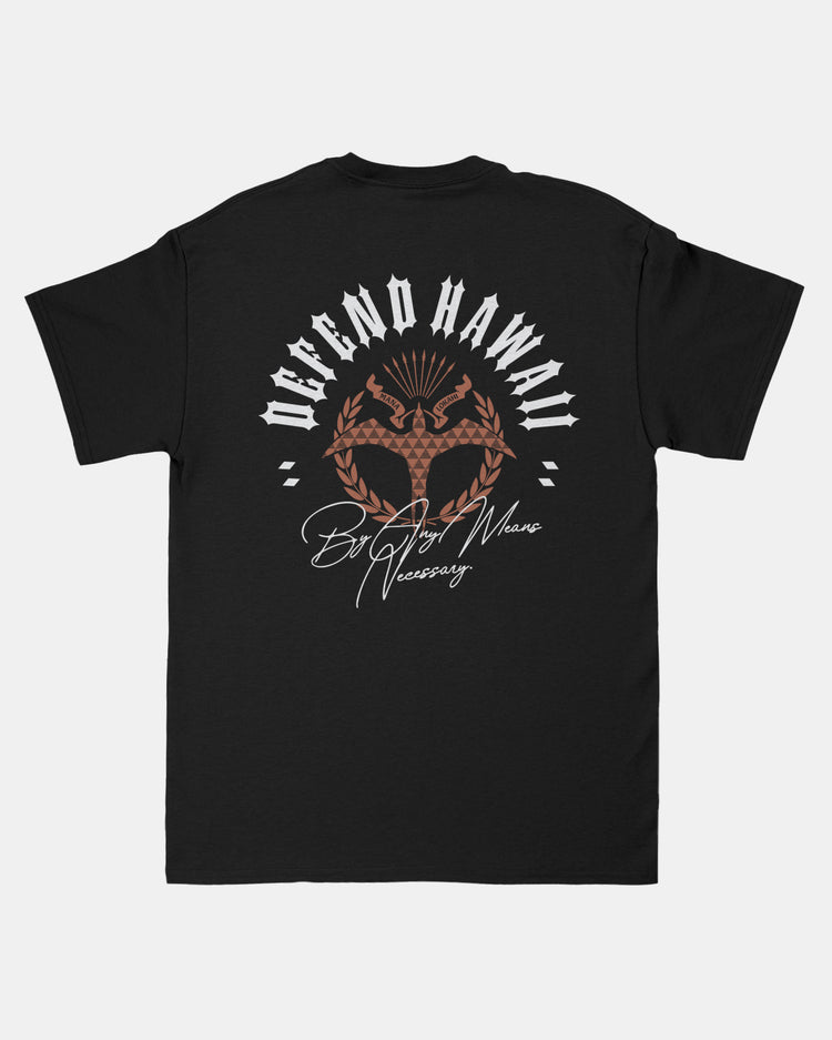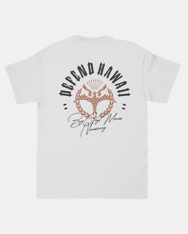 Defend Hawai'i - Using our power as a reminder-Defend Hawaii By Any Means Necessary. This is, Suncrest. Featuring a pocket hit and an Iwa bird centered back hit. Pick your favorite colorway, this one comes in white and orange ink on a black, white, and tan casual fit t-shirt. Your everyday tee to DEFEND with.