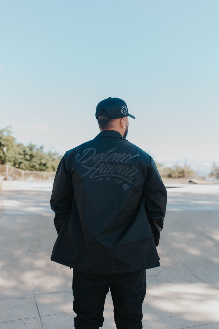 Defend Hawai'i - The iconic, never duplicated, stapled Wildstyle 'Elua logo. Featuring a subtle pocket hit paired with a mayjah back hit, this time puffed to perfection. This one comes in black puff ink on a black water repellent coaches jacket. Your everyday tee to DEFEND with.