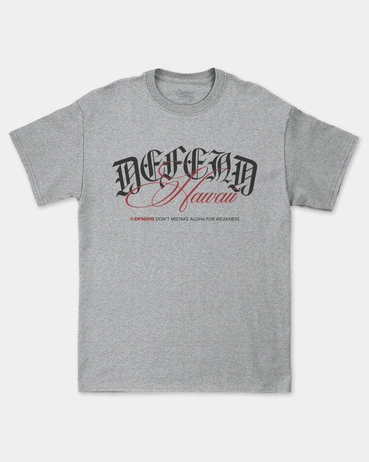 Defend Hawai'i - Introducing BL Script, a full frontal scripty logo with a reminder-By Any Means Necessary. Pick your favorite colorway, this one comes in white and red ink on a black, blue, or athletic heather casual fit t-shirt. Your everyday tee to DEFEND with.