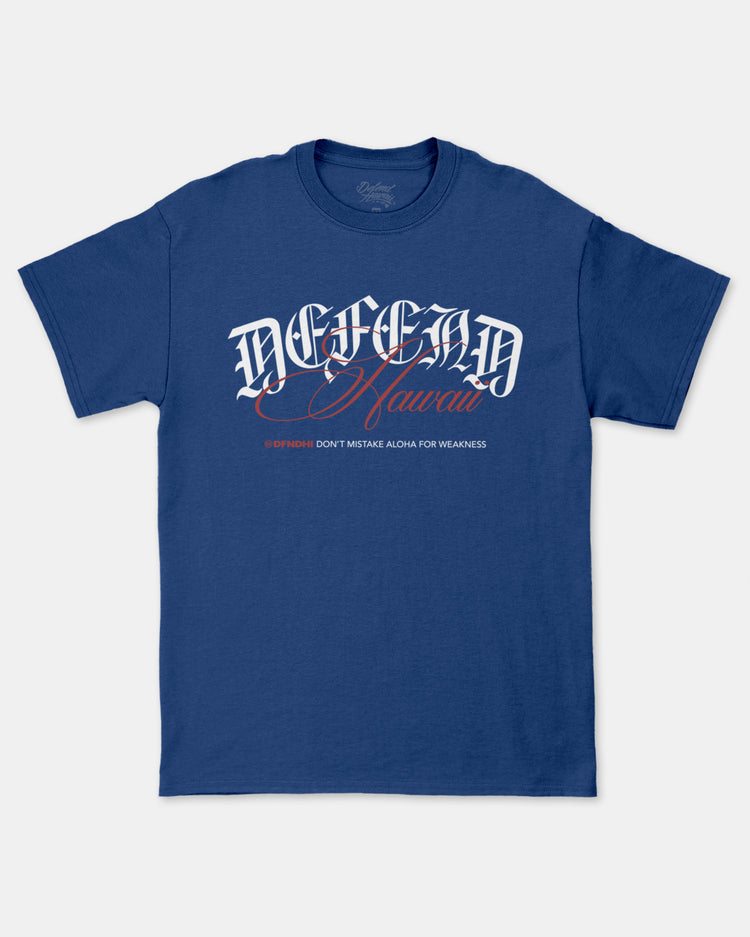 Defend Hawai'i - Introducing BL Script, a full frontal scripty logo with a reminder-By Any Means Necessary. Pick your favorite colorway, this one comes in white and red ink on a black, blue, or athletic heather casual fit t-shirt. Your everyday tee to DEFEND with.