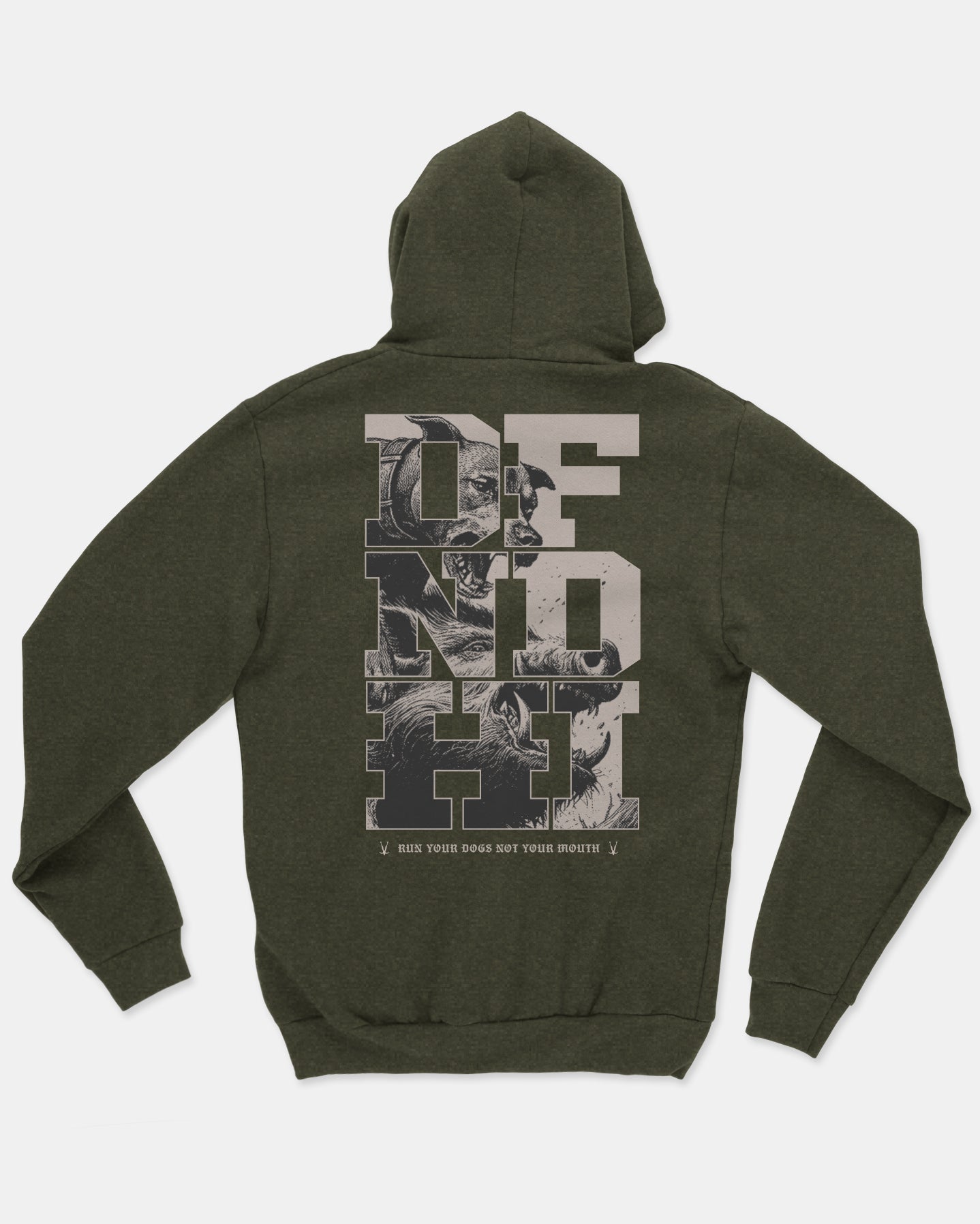 Defend Hawai'i - A new addition to our eradicators saga for da boar huntahz, and an homage to the huntin dogs. This is DFNDHI Killaz. Featuring a double pocket hit and rowdy back hit. Pick your favorite color way. This one comes in gray and natural ink on a green heather medium fleece pullover hoodie.