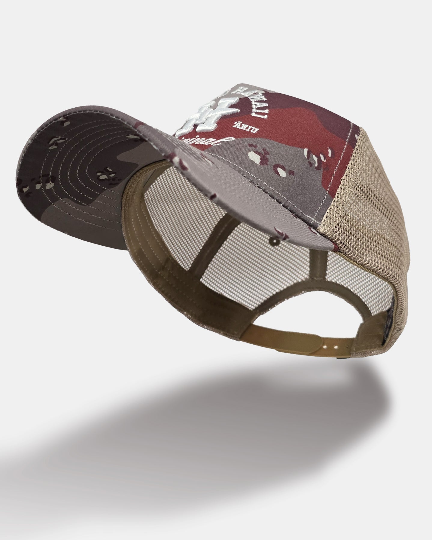 Defend Hawai‘i - The beloved H Spear design reworked for the Iʻiwi bird. This is ʻIʻiwi Desert, embroidered in white on a desert camo a-frame snapback. This one is a desert camo cotton a-frame snapback hat, with a desert camo crown, tan  eyelets, desert camo brim, and button with a snap closure.