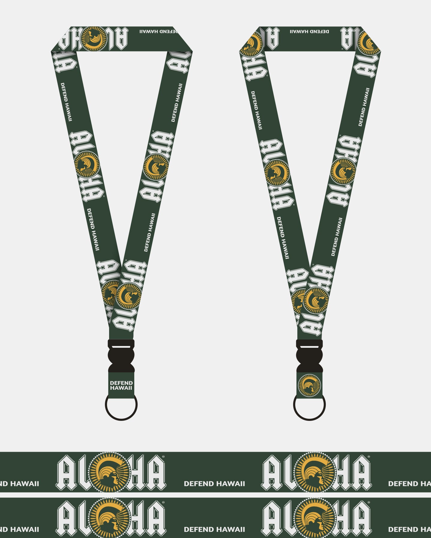 Defend Hawai'i accessories. One of our most popular products and an easy gift for anyone, a Defend Hawai'i lanyard. Mai Ka Po Lanyard, yellow and white on a green background.