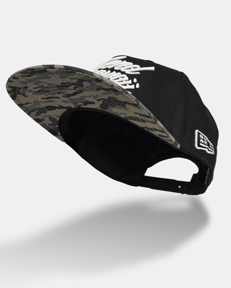 Defend Hawai'i - Back with another staple Wildstyle Logo hat. This time embroidered in white on a black and camo flatbill snapback. With a black crown, black eyelets, camo brim, and button with a snap closure.