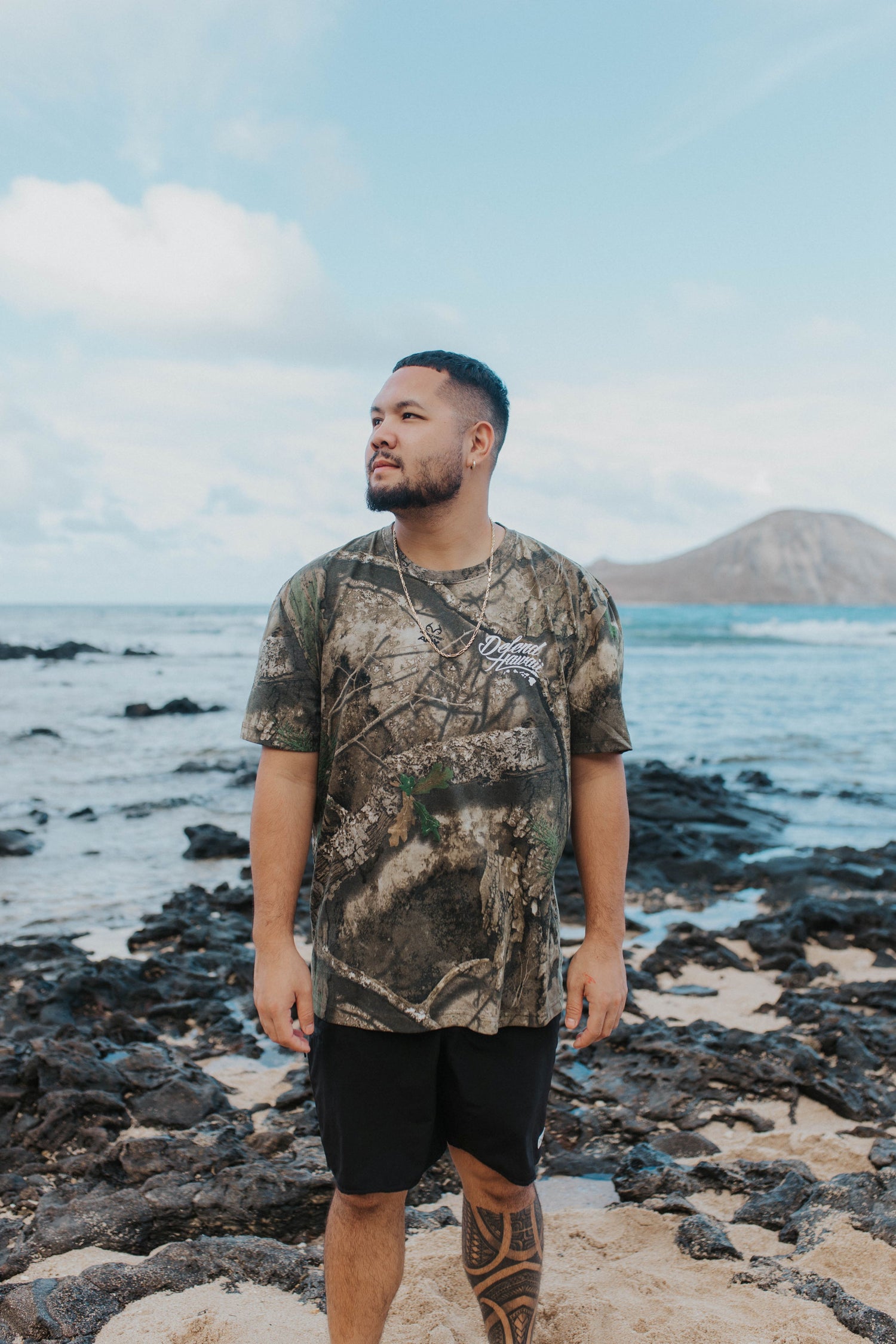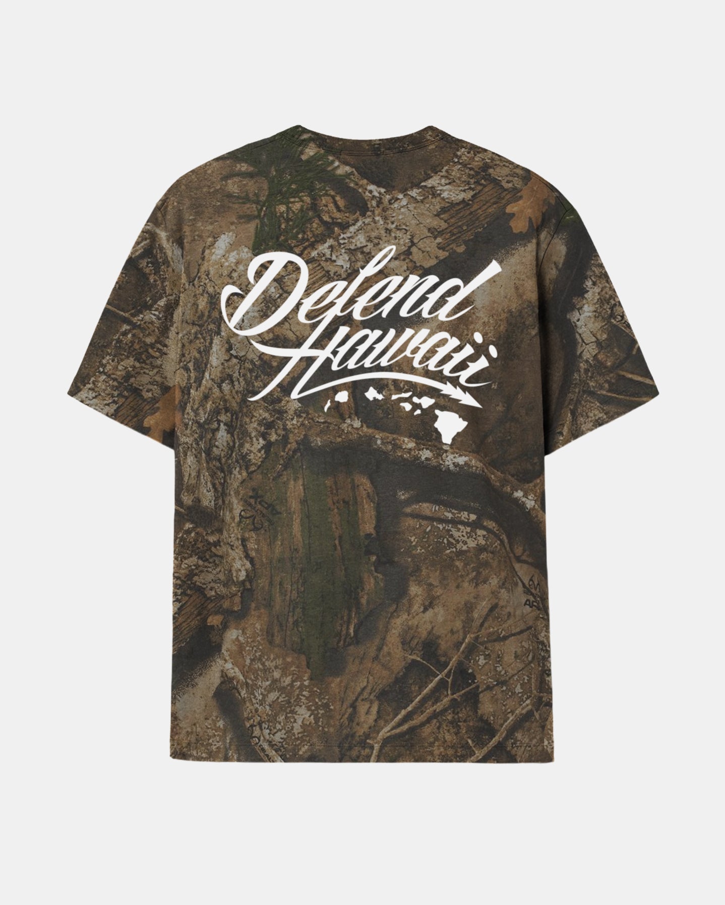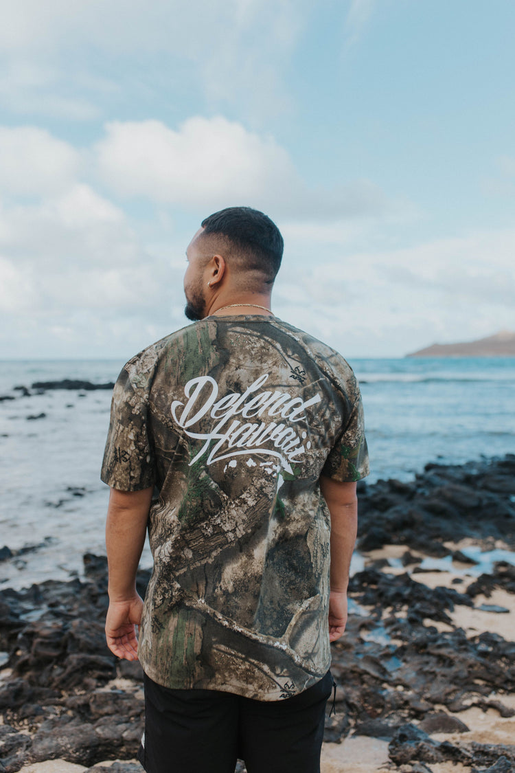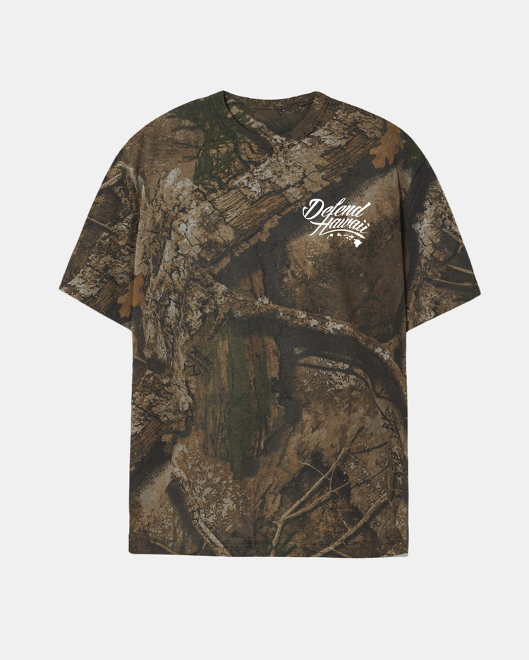 Defend Hawai'i - The iconic, never duplicated, stapled Wildstyle 'Elua logo. Featuring a subtle pocket hit paired with a mayjah back hit. This one comes in white ink on a tree camo casual fit t-shirt. Your everyday tee to DEFEND with.